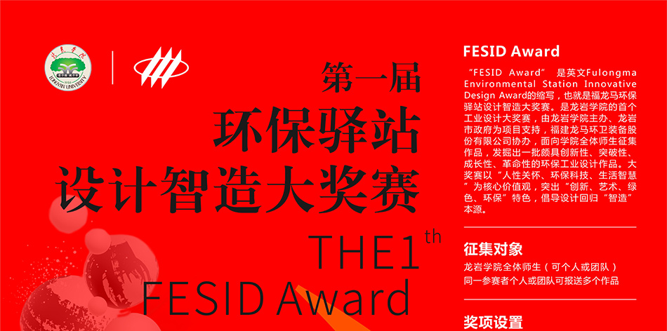 “FESID Award” 是英文 Fulongma Environmental Station Innovative Design Award 的缩写,也就是福龙马环保驿站设计智造大奖赛。是龙岩学院的首个工业设计大奖赛,由龙岩学院主办、龙岩市政府为项目支持,福建龙马环卫装备股份有限公司协办,面向学院全体师生征集作品,发掘出一批颇具创新性、突破性、成长性、革命性的环保工业设计作品。大奖赛以“人性关怀、环保科技、生活智慧”为核心价值观,突出“创新、艺术、绿色、环保”特色,倡导设计回归“智造”本源。