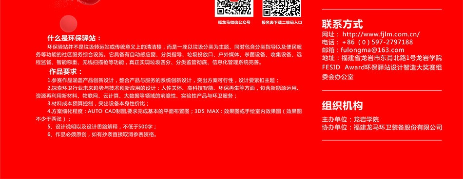 地址:福建省龙岩市东肖北路1号 龙岩学院 FESID Award 环保驿站设计智造大奖赛组委会办公室
