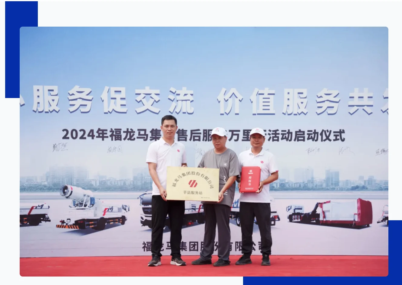 自2012年以来,福龙马集团持续开展“售后服务万里行”活动,累计服务里程已超过50万公里,服务客户单位超过1300家。我们始终坚持在100公里范围内为客户提供24小时内现场服务,以确保问题及时解决。对于超出此范围的客户或需要协调配套厂家的情况,公司承诺在2-4小时内给予明确答复。福龙马集团致力于以高效和专业的服务态度满足客户需求,兑现服务承诺。