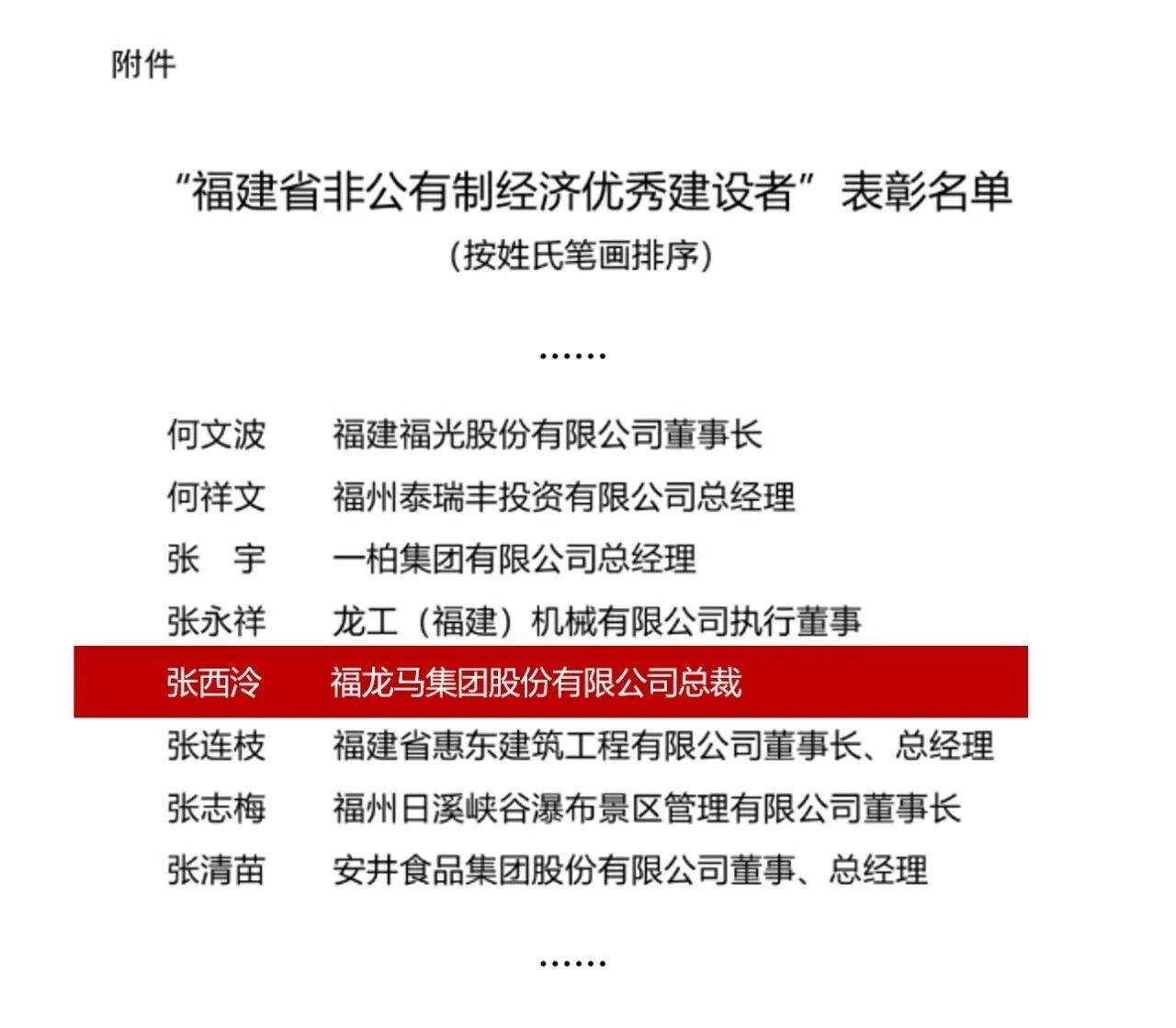 6月16日,福建省人民政府发布《关于表彰福建省非公有制经济优秀建设者的决定》,福龙马集团股份有限公司总裁张西泠凭借在非公有制经济领域的突出贡献,成功入选“福建省非公有制经济优秀建设者”表彰名单。 《决定》中指出,非公有制经济是社会主义市场经济的重要组成部分,此次表彰旨在“表彰先进、树立典型”,激励全省广大非公有制经济人士“大力弘扬企业家精神、闽商精神,始终保持爱拼会赢的精气神,胸怀报国志、一心谋发展、守法善经营、先富促共富”,为谱写全面建设社会主义现代化国家福建篇章而努力。 作为企业核心管理者,张西泠始终秉持创新理念,带领福龙马在智能装备制造和环境产业生态运营领域深耕细作,推动智能环卫车辆研发及智慧环卫生态体系建设,为城市人居环境卫生提供智能化整体解决方案;同时积极践行社会责任,在扶贫济困、乡村振兴等领域持续投入,以“爱拼会赢”的闽商精神带动企业诚信经营、创新发展。此次荣获表彰,既是对其个人深耕行业、担当奉献的肯定,也是福龙马集团作为福建民营经济重要力量的实力彰显。福龙马将以此为新起点,坚守实业、开拓创新,为新时代民营经济发展贡献力量。