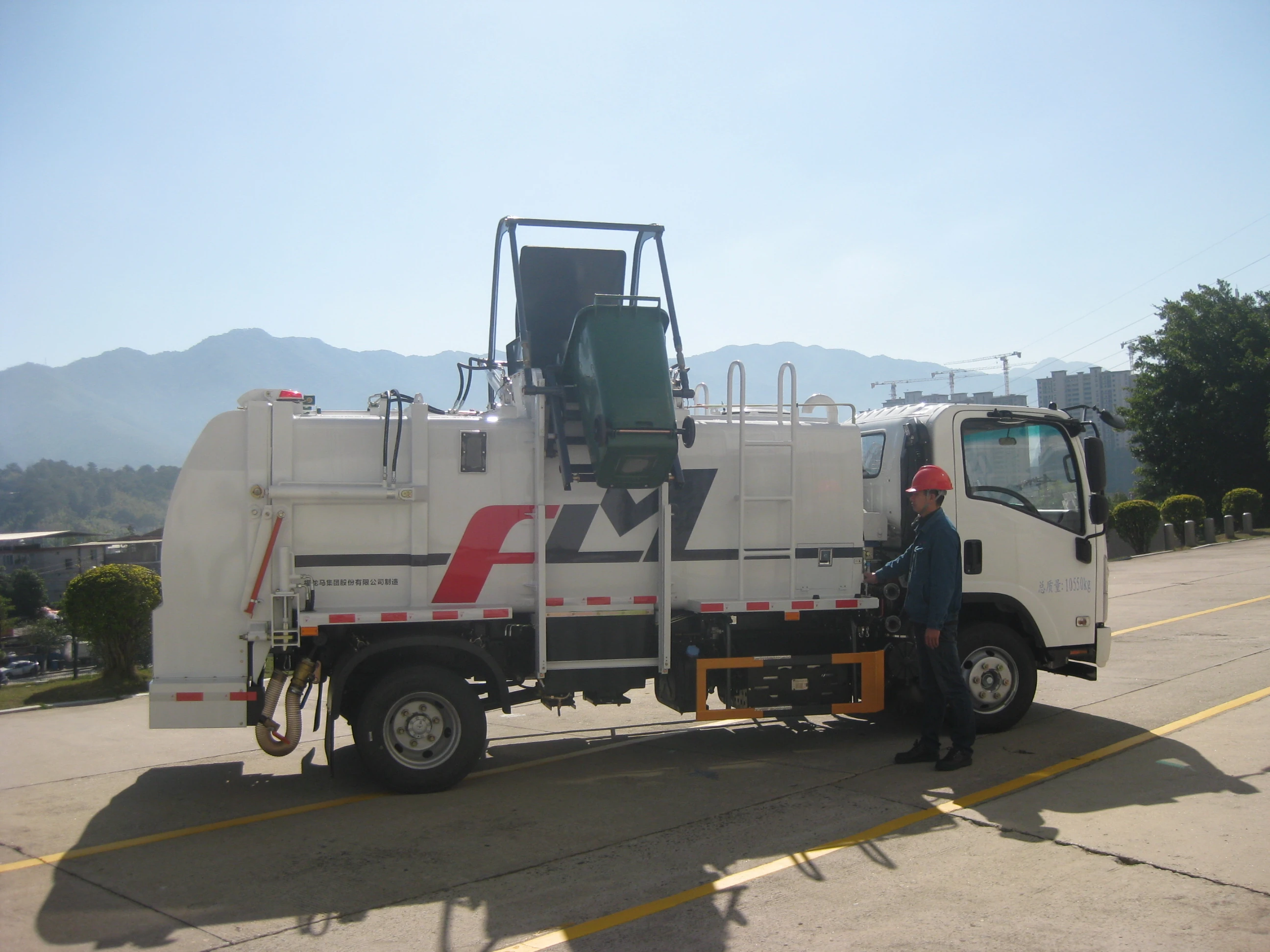 右侧设有提升及压桶机构,可提升120、240升标准垃圾桶;动作顺畅,⾃动化程度⾼。