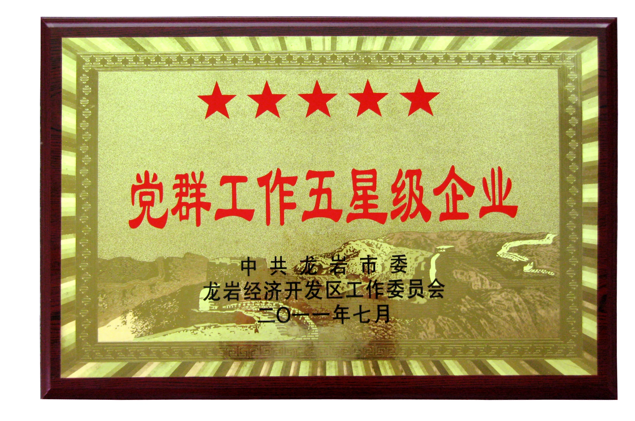 龙岩市党群工作五星级企业牌匾