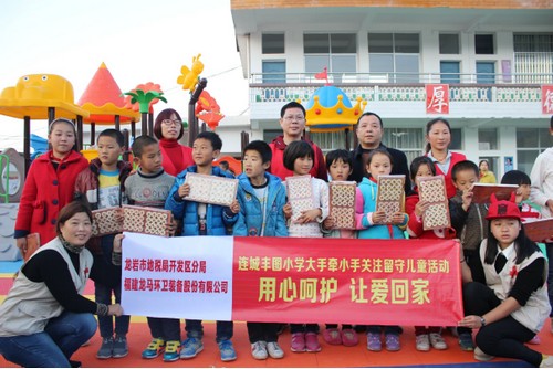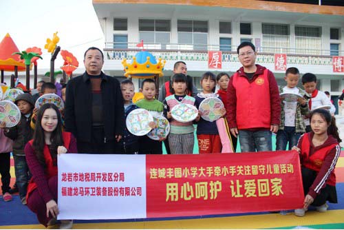 12月18日,由龙岩义工俱乐部、龙岩青年志愿者协会、龙岩地税局开发区分局主办,福建龙马环卫装备股份有限公司协办的连城丰图小学大手牵小手关注留守儿童“用心呵护、让爱回家”爱心物资捐赠公益活动在丰图小学拉开了序幕。龙马环卫党支部为该校218名儿童捐赠了文具、保温杯、跳绳等学习、生活用品,为孩子撑起一片爱的天空。