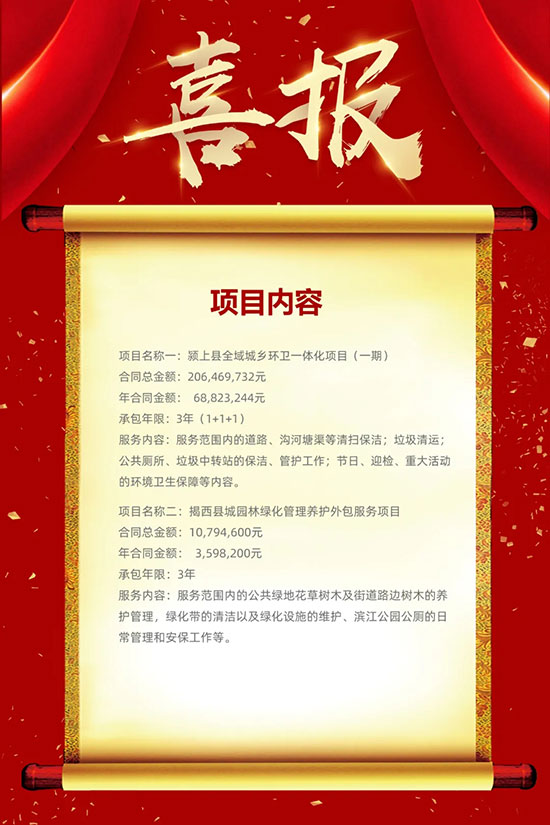 近日,福建龙马环卫装备股份有限公司(以下简称“公司”)陆续收到《中标通知书》。确认公司中标安徽省阜阳市颍上县全域城乡环卫一体化项目(一期)和广东省揭阳市揭西县城园林绿化管理养护外包服务项目。