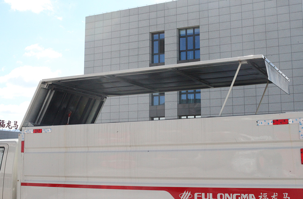 福龙马牌密闭式桶装垃圾车底盘尾部配套尾板升降系统,适合小区街道、垃圾中转站等场所桶装垃圾的收集、运输。