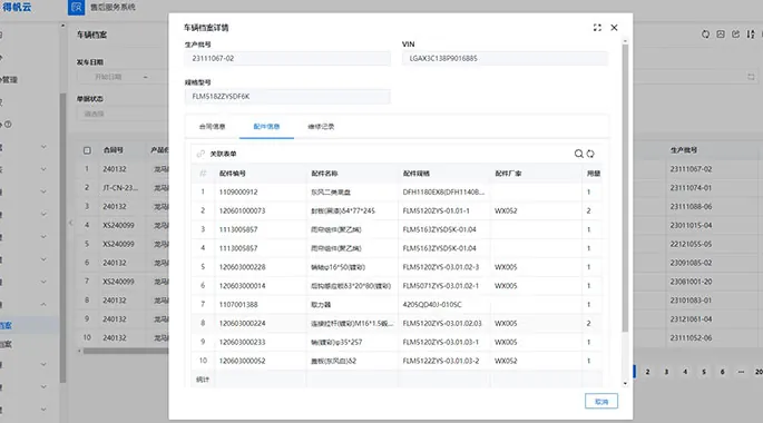 实现车辆一车一码管理,通过车辆识别号关联车辆配件生产料单,实现整车配件快速准确查询、追溯,提升配件发货准确性。